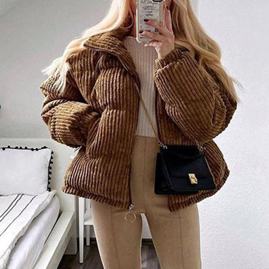 Stand Up Cord Puffer Jacket-Cream