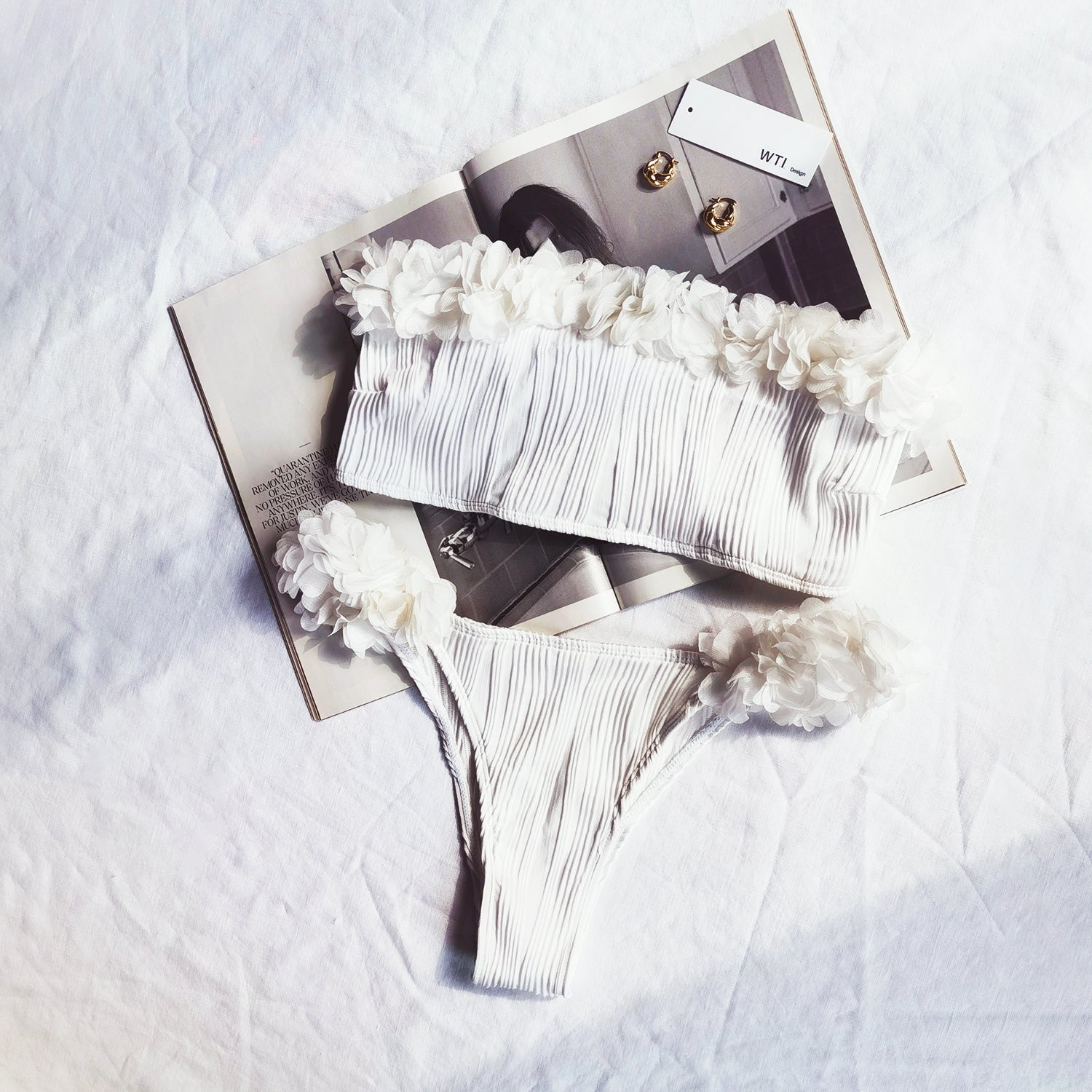 Ribbed 3D Floral Bandeaux Bikini Swimsuit